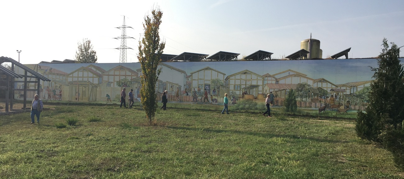 Wandpanorama mit römischen Streifenhäusern, links das Mithräum